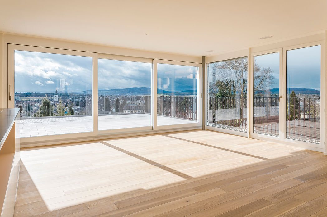 Die südlich ausgerichteten und erhöht an der Gstücktstrasse liegenden Baukörper lassen aus jedem Geschoss den Blick über ganz Bülach zu. Die Topographie der Parzelle ermöglicht grosszügige, terrassenartige Aufenthaltsbereiche, insbesondere für die Gartengeschosswohnungen.